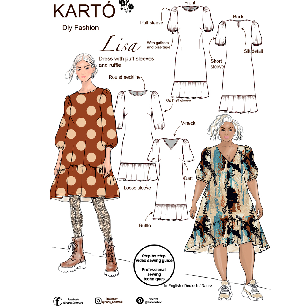The Lisa Dress features a loose, comfortable fit and is finished with a wide ruffle at the hem, adding a soft and feminine touch. Choose between a round or V-shaped neckline, and sew the puff sleeves in different lengths to match your style.